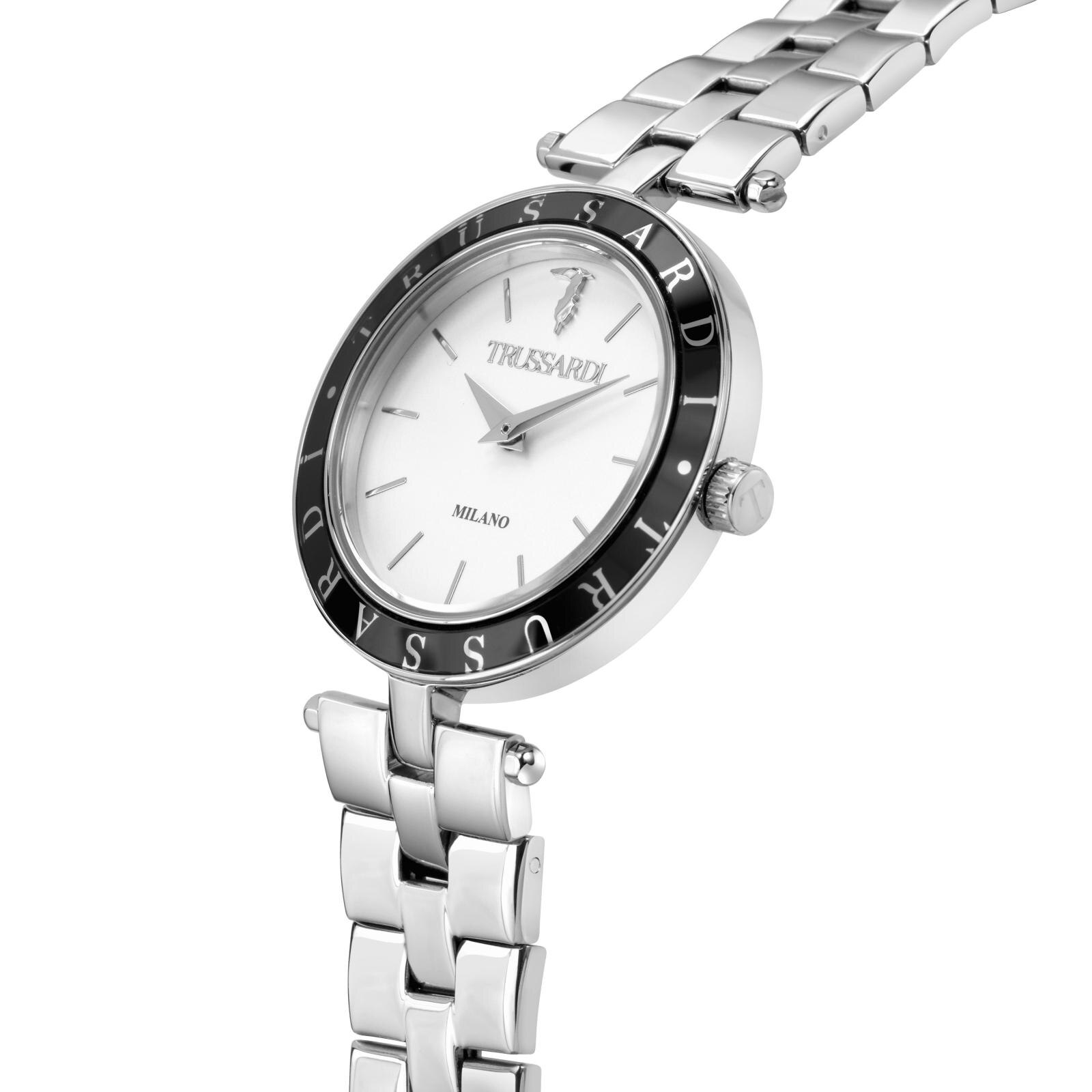 Zegarek Trussardi Mod. R2453145504 z kolekcji T-Shiny to elegancki damski czasomierz, który łączy styl i minimalizm. Koperta ze stali nierdzewnej w kolorze srebrnym, biała tarcza, dwa wskazówki (godzina/minuta) oraz bransoleta stalowa tworzą subtelną całość. Wodoodporność pozwala na użytkowanie w standardowych warunkach codziennych. Idealny na co dzień i do bardziej eleganckich stylizacji.