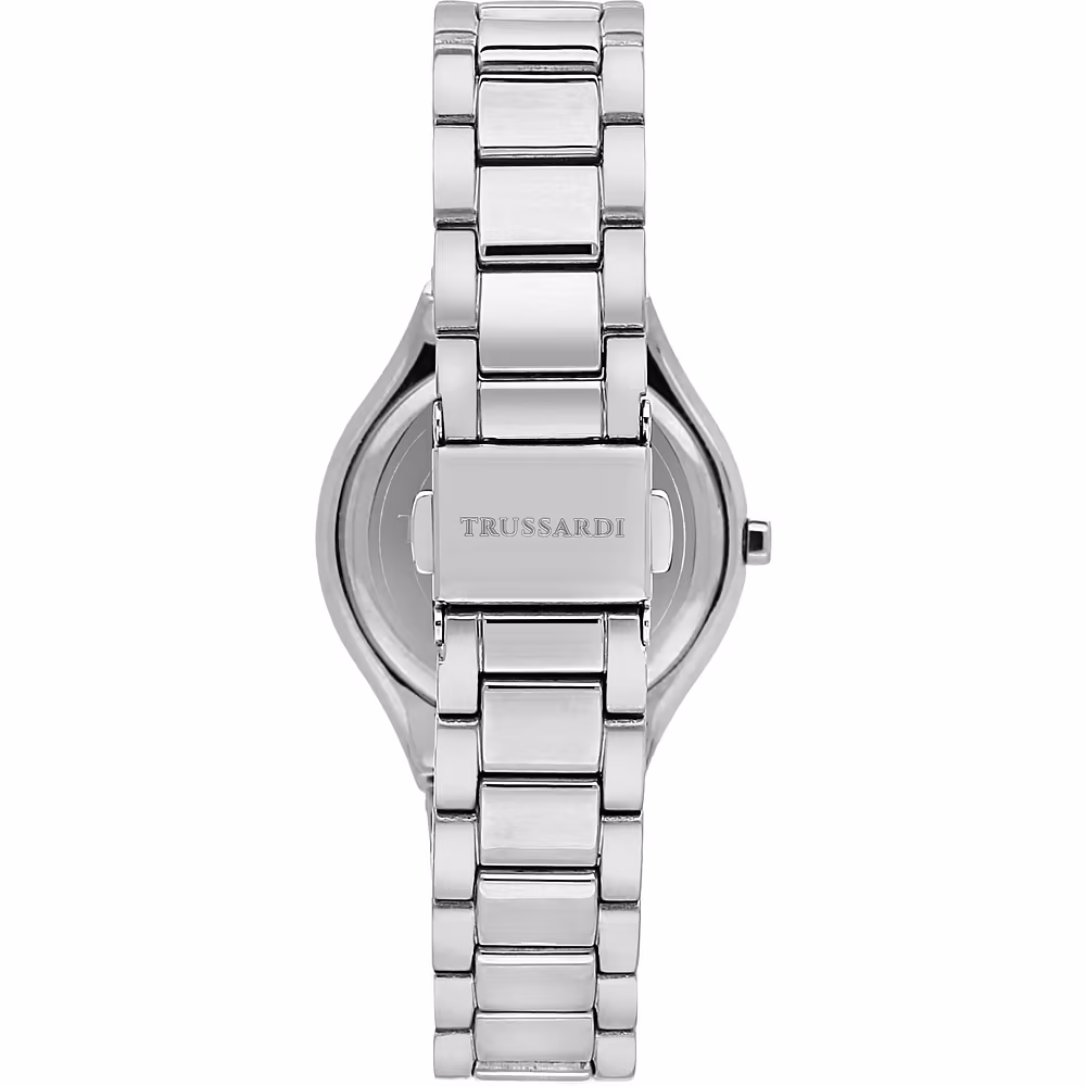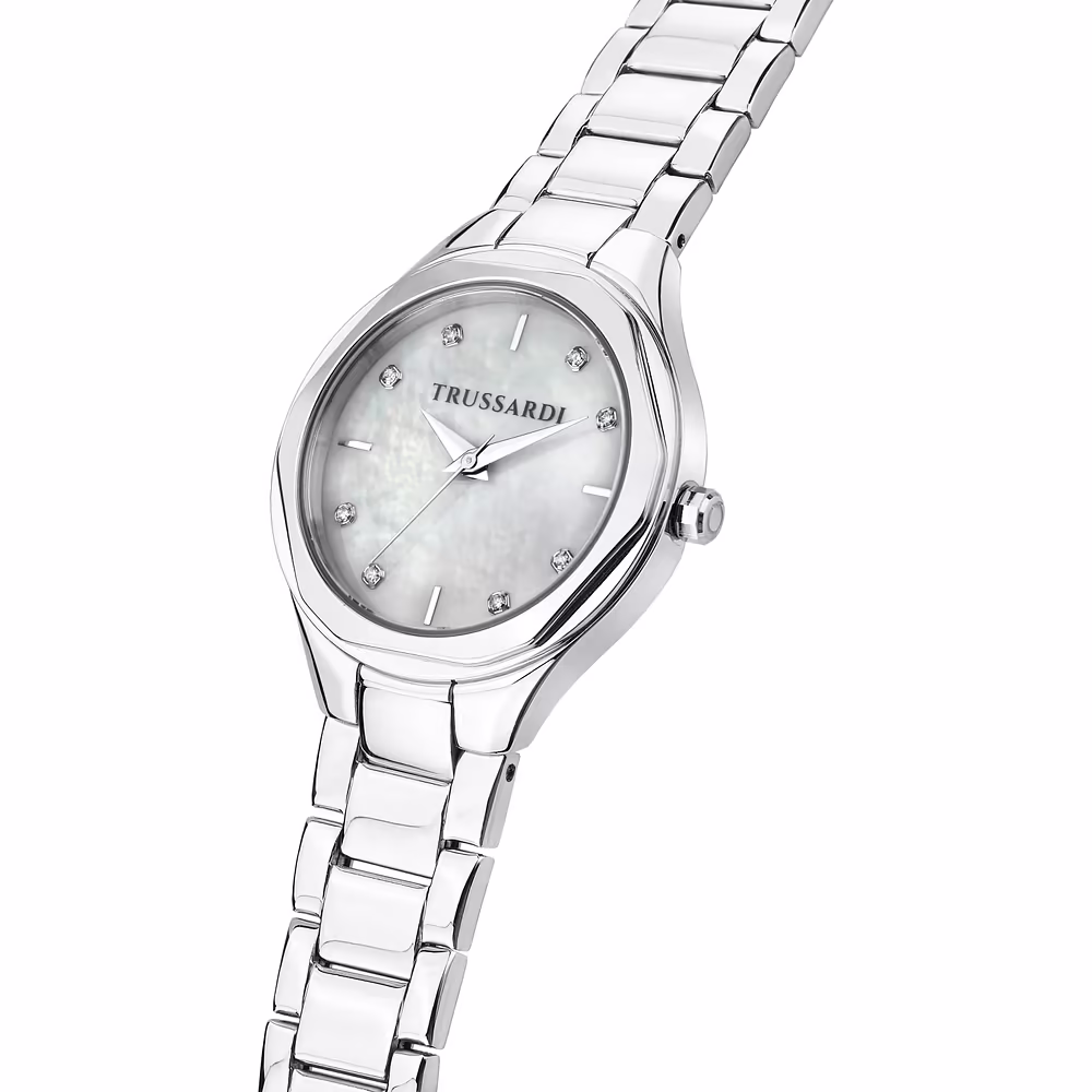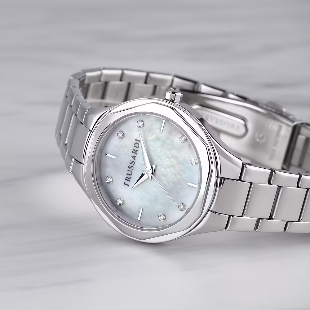 Zegarek Trussardi Mod. R2453157502 z kolekcji T-Sky to elegancki damski czasomierz typu „Only Time”, który wyróżnia się subtelną tarczą typu mother-of-pearl z diamentowymi indeksami. Smukła koperta ze stali nierdzewnej o średnicy 32 mm i srebrna bransoleta tworzą ponadczasową całość. Dzięki wodoodporności 5 ATM oraz mechanizmowi kwarcowemu zegarek łączy w sobie styl i funkcjonalność, idealny zarówno na co dzień, jak i na specjalne okazje.